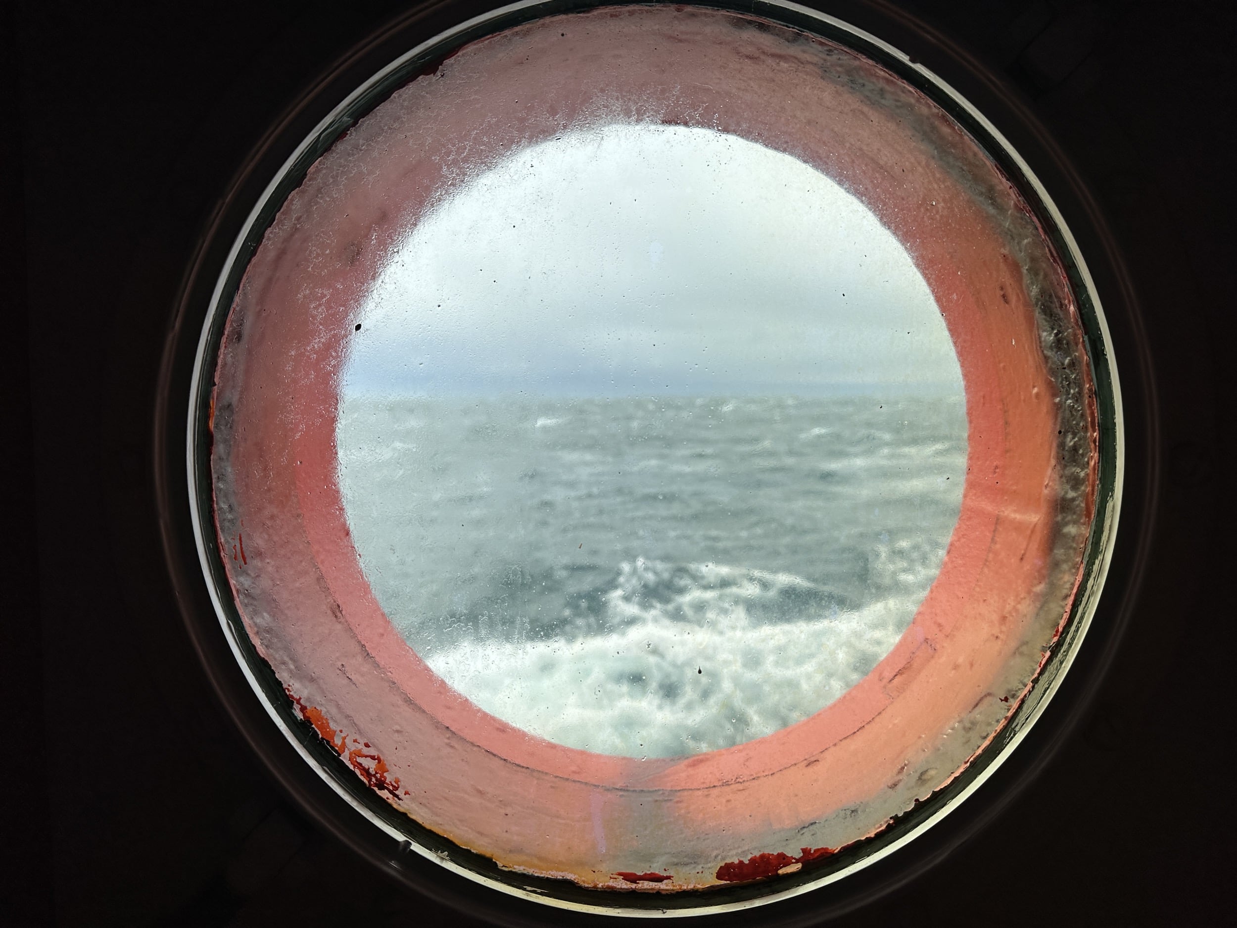 The next 48 hours were a bit of a blur. As the seas got heavier, the only real respite for me was lying down in my bunk, being horizontal, closing my eyes, and sensing the motion of the ship in my body as the pressure would rock back and forth from my head to my toes. It was hard sitting down at the galley and eating, it was hard being in the lounge watching movies, so I was just lying in bed sleeping something like 18+ hours a day. In between sleeps and naps and sleeps and naps, I would take walks out on the deck and get some wind in my whiskers. It was really fun standing out there, holding on, while the ship would ride up and down on 15 to 20-foot rollers.