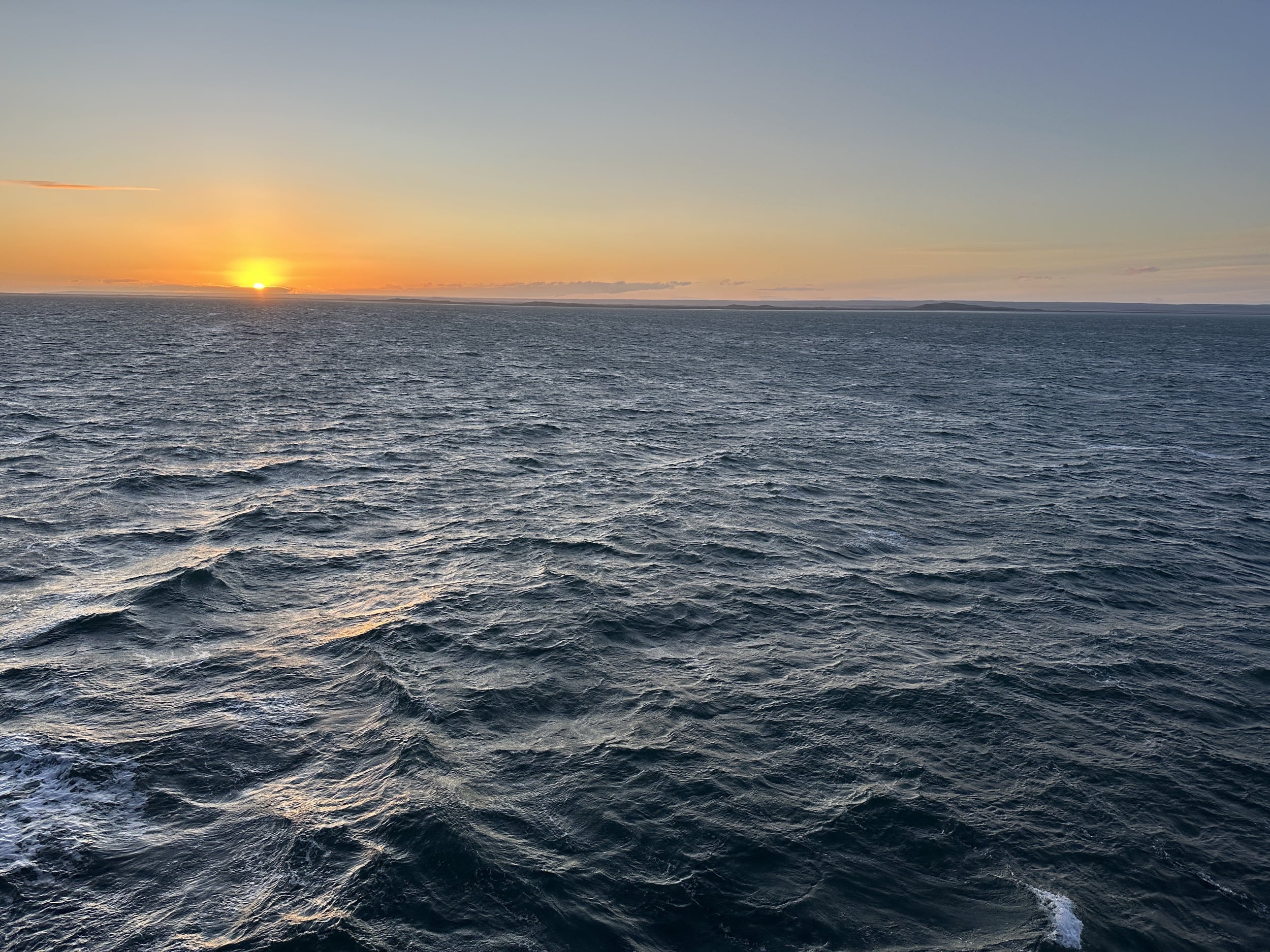 The scopolamine patch was working wonders so far, I felt no motion sickness at all, but also at that point we were still well within the mellow zone: just out from the Straight of Magellan, going south along the coast of Tierra del Fuego. And, actually, we were intentionally going extra slow for a while because there was a pretty nasty storm rolling through out in the Drake Passage, and the captain was hoping to let the bulk of it pass by before we ventured forth. It was mellow day again – movies in the lounge, meals in the galley, Mario Kart, and occasionally stepping out on the deck to see what we could see: another glorious sunset!