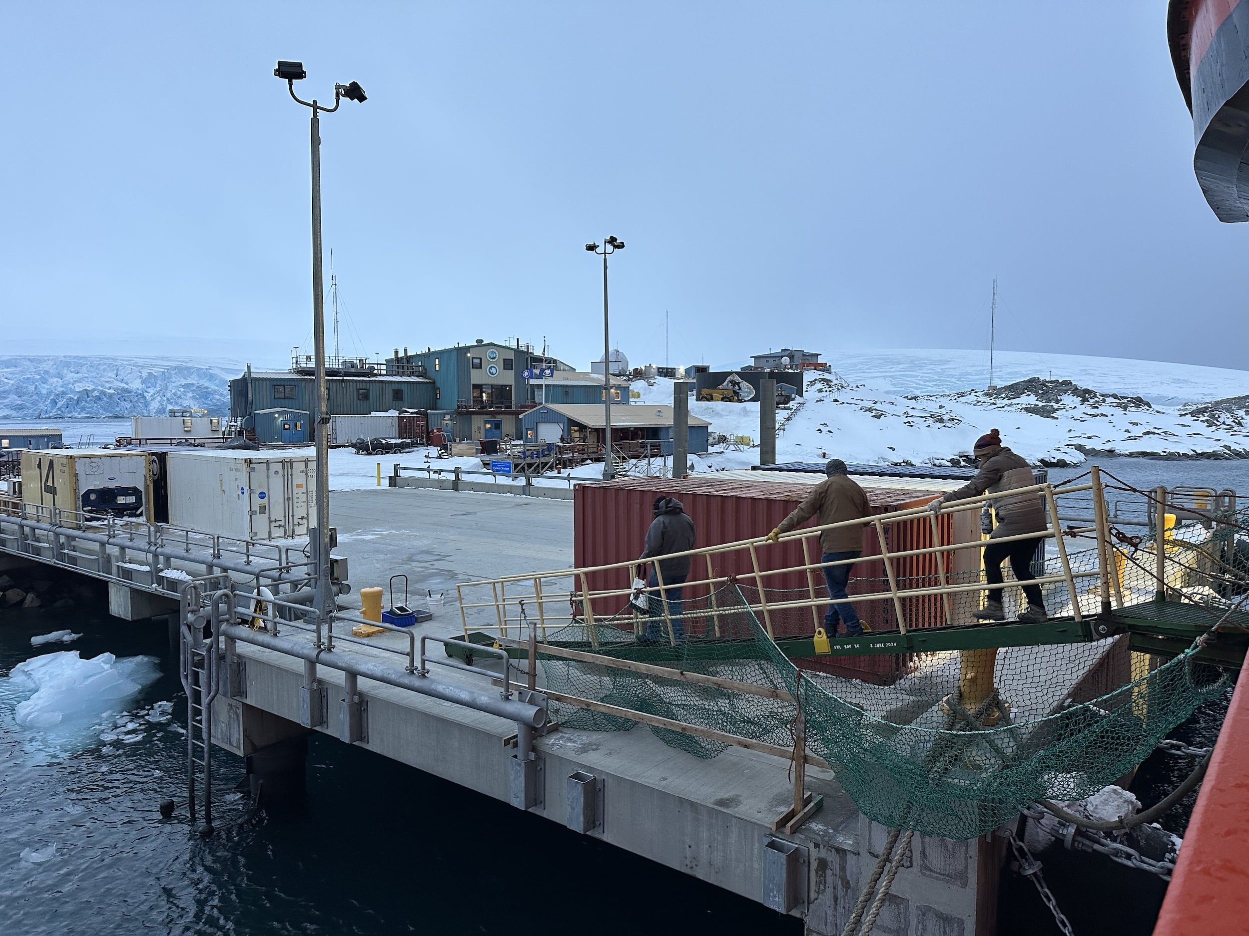 As we got closer, we could see some of the winter-over crew gathering out on the pier. Many of them were there as line-handlers to coordinate with the ship and help get us tied off. Some of our crew on the boat started to recognize actual faces and people on both sides started shouting names and screaming their hellos.