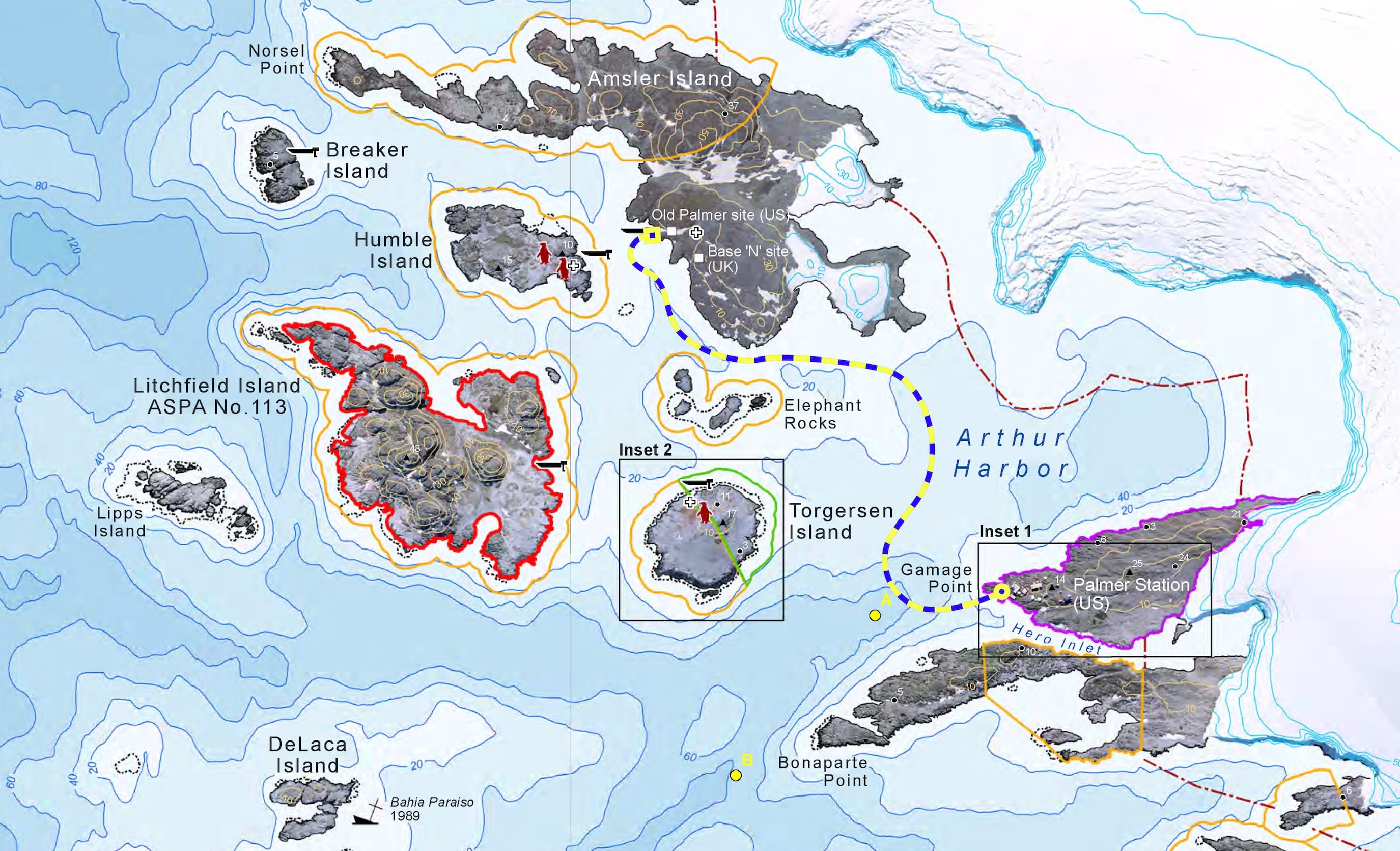 On this lovely day in question, we gathered ourselves and set out for Amsler Island. You can see it from station, it's just across the way on the other side of Arthur Harbor, and it's the home of Old Palmer Station!