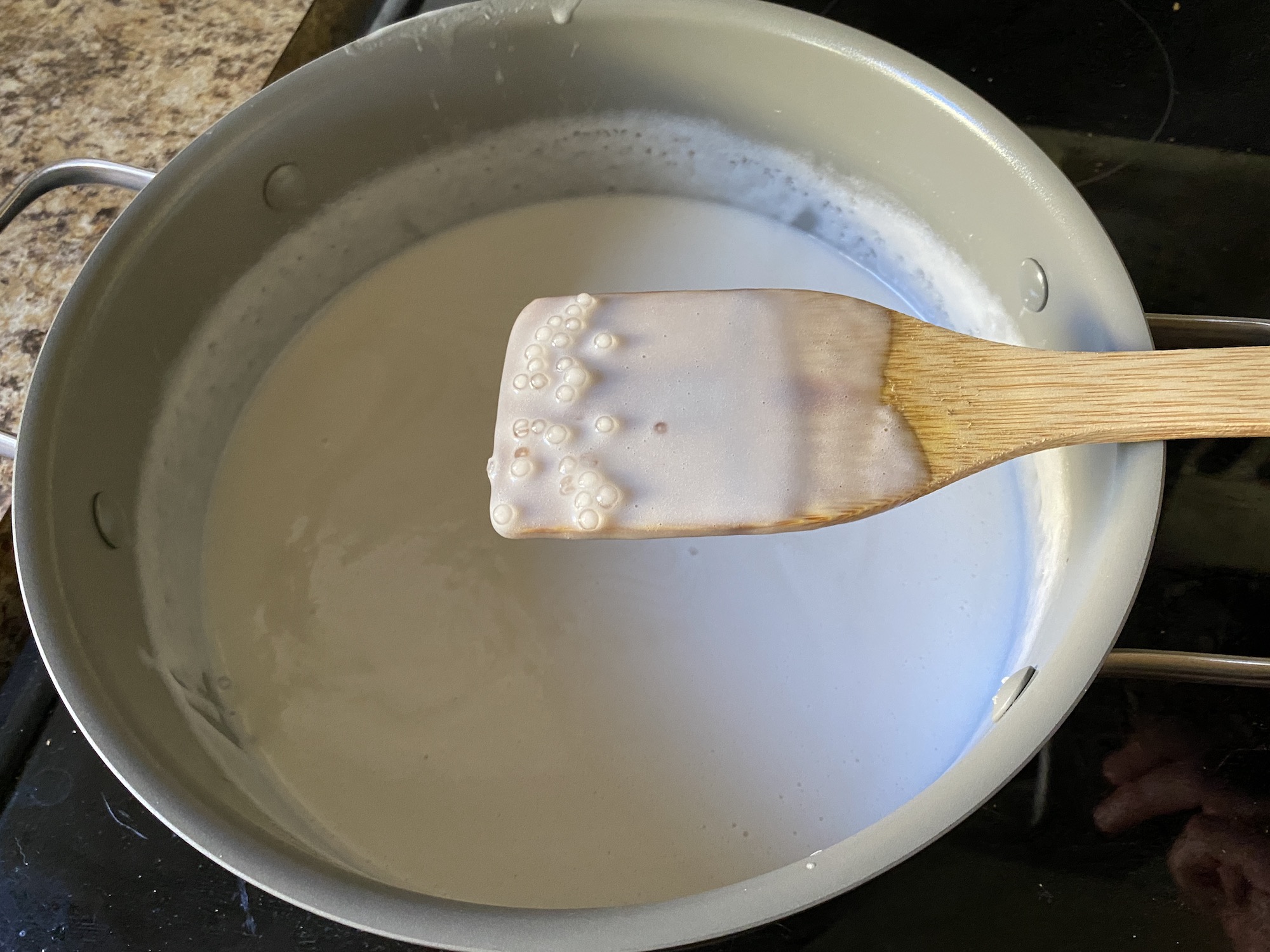 - Mix the sugar and salt into the tapioca mixture and then heat over medium heat until it is simmering pretty good.