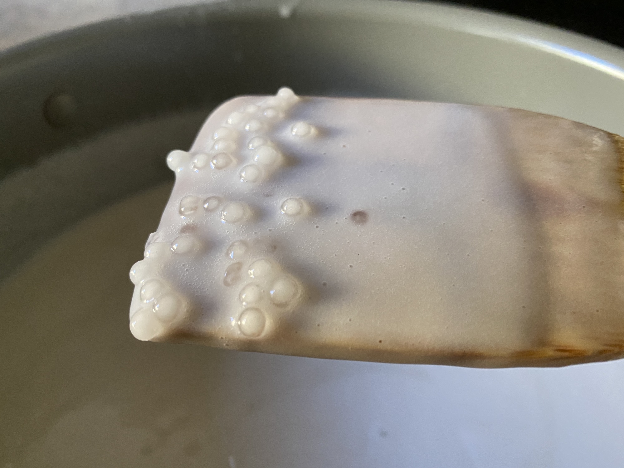 - Reduce heat to low/med and let simmer for 15 minutes until tapioca pearls are transparent and the mixture has thickened. BE CAREFUL: keep an eye on things and stir frequently to avoid those little tapiocas getting stuck on the bottom of the pan.