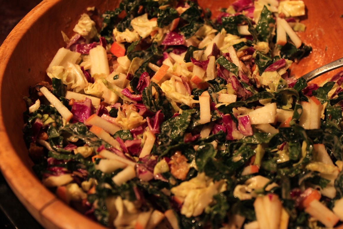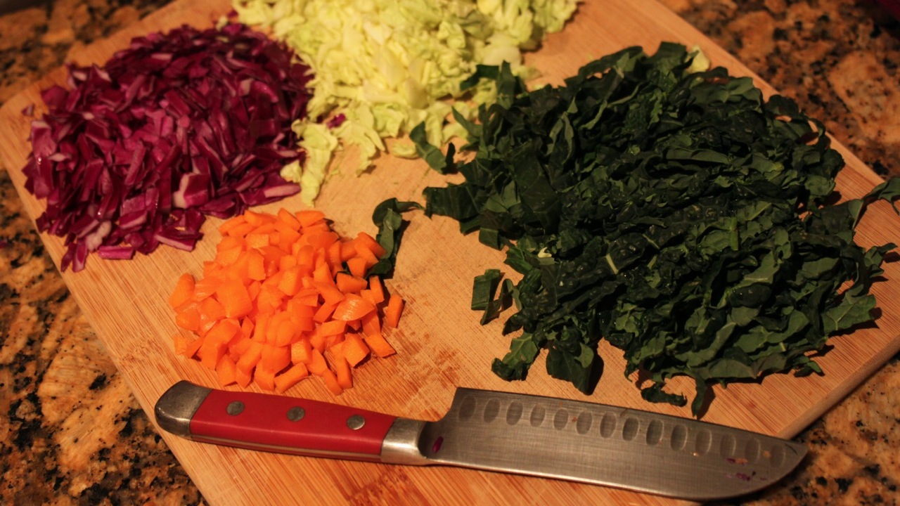 - Chop up the kale, cabbage, apple, and carrots as fine as you can. The smaller the better.