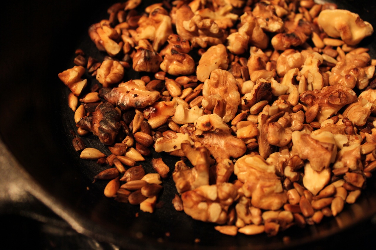 - Put the nuts (walnuts, sunflower, sesame, etc) in a small frying pan on the stove on medium high heat.